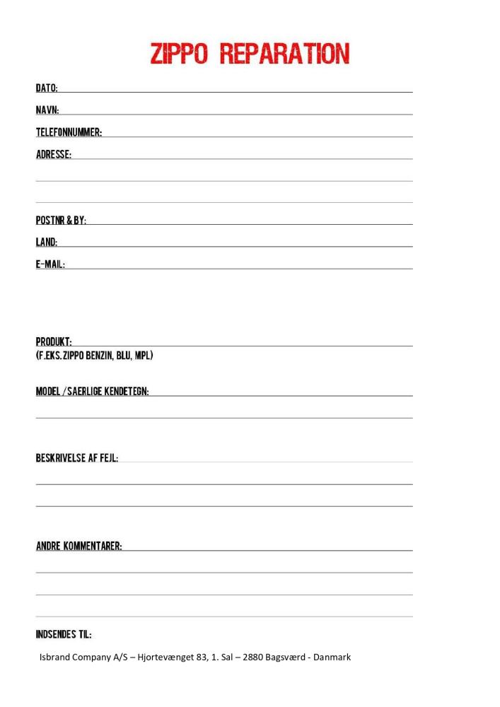 Pakk produktet forsvarlig sammen med skjemaet/informasjonen og send det til oss, bruk en stor eske eller boblekonvolutt. Hvis du har ytterligere spørsmål angående reparasjon, er du velkommen til å kontakte oss på reparation@zippo.dk eller ringe +45 3543 6800.